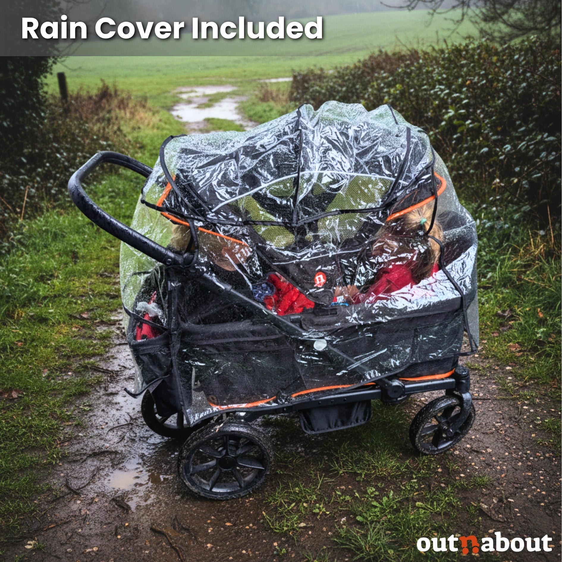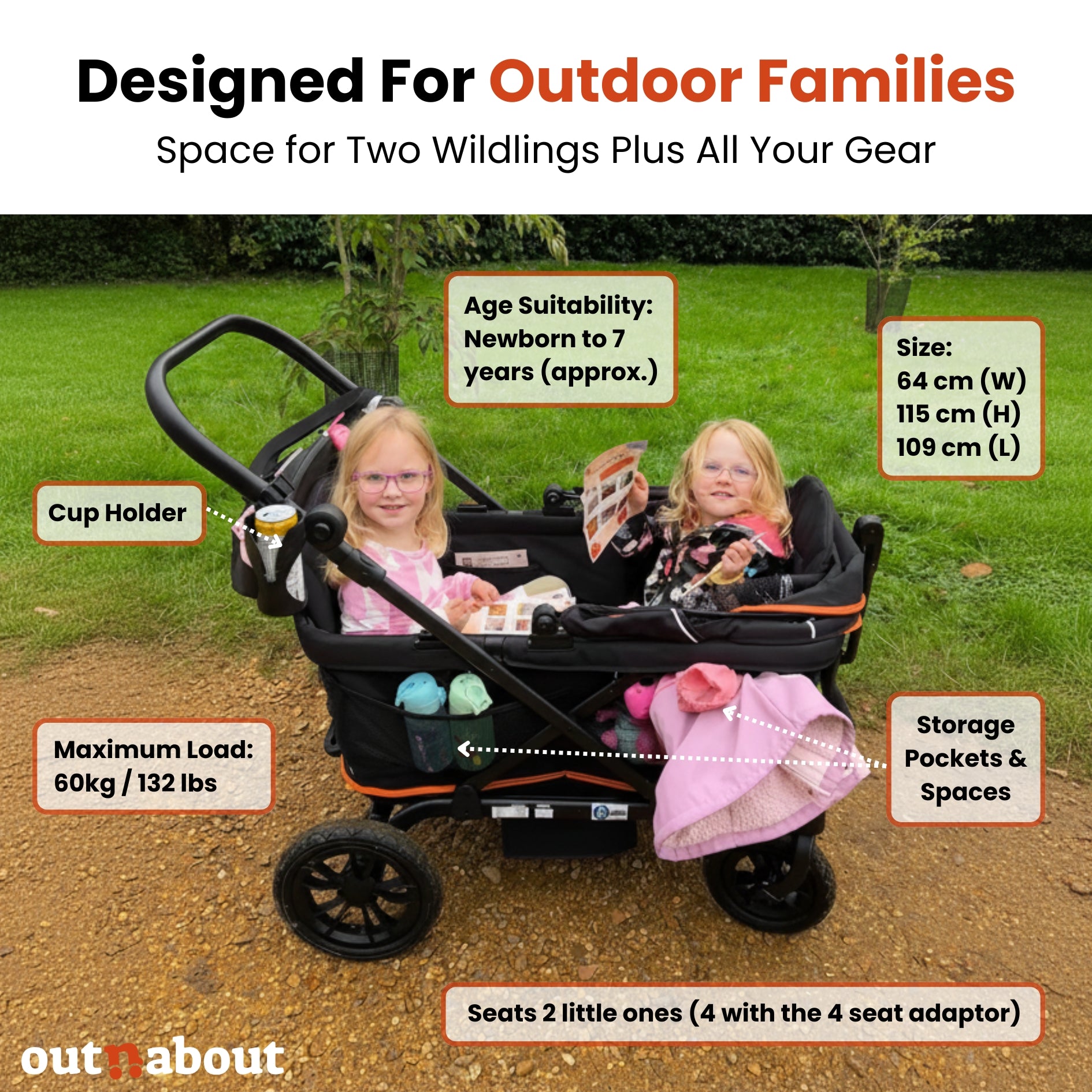 The Nipper Wagon is a versatile push-and-pull all-terrain stroller wagon with seating for two children, two removable seats with 5-point safety harnesses, and the flexibility to create a lay-flat interior or a lowered floor for comfortable sitting. It features technical water-resistant fabrics, extendable sun and UV visors, a rain cover and cupholder included, and generous netting storage inside and out. Swivel/lockable front wheels make it easy to manoeuvre, and it’s designed for comfort, convenience, and adventure.