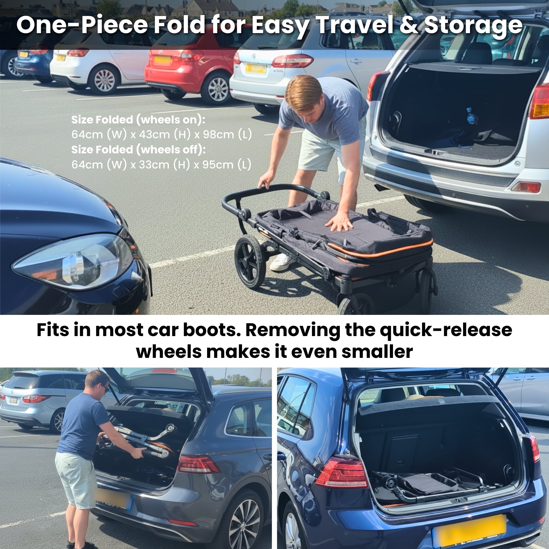 Yes – it folds to fit in most car boots. Removing the quick-release wheels makes it even smaller.