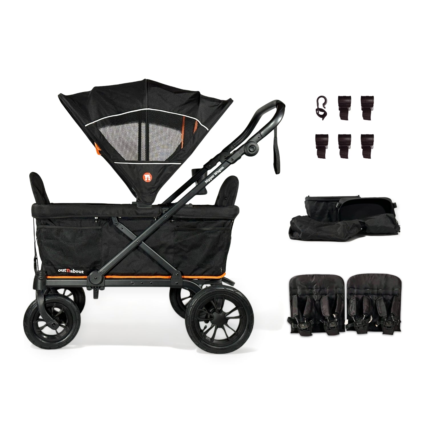 The Nipper Wagon is a versatile push-and-pull all-terrain stroller wagon with seating for two children, two removable seats with 5-point safety harnesses, and the flexibility to create a lay-flat interior or a lowered floor for comfortable sitting. It features technical water-resistant fabrics, extendable sun and UV visors, a rain cover and cupholder included, and generous netting storage inside and out. Swivel/lockable front wheels make it easy to manoeuvre, and it’s designed for comfort, convenience, and adventure.